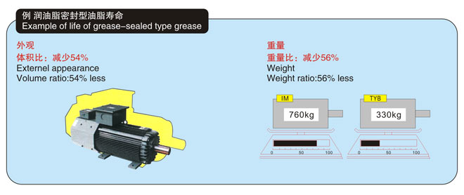 因?yàn)檗D(zhuǎn)子幾乎不發(fā)生損失,所以軸承溫度較低,密封油脂壽命大約延長(zhǎng)至本公司YVF2系列變頻器專用IM的